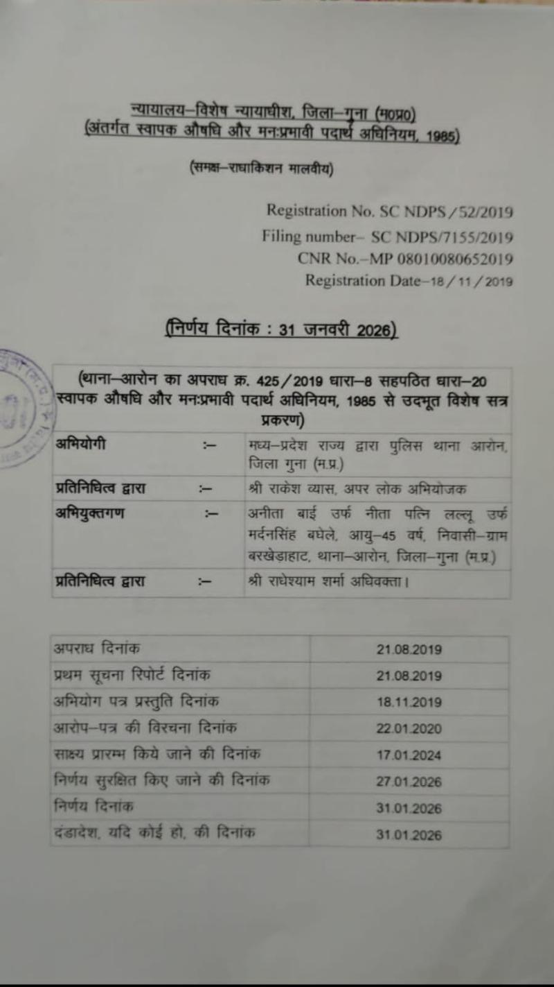 गुना। मामला बर्ष 2019 का थाना आरोन का विशेष लोक अभियोजक राकेश व्यास ने बताया कि दिनांक 21/08/19 को थाना आरोन में पदस्थ उप निरीक्षक मलखान सिंह परिहार मुखबिर सूचना पर से मुखबिर के बताए स्थान पर पहुंचे । जहां छिपकर मुखबिर की सूचना की तस्वीर करने लगे तभी लगभग 17:00 बजे मुखबिर के बताएं नाम हुलिया की संदेहिया आते दिखी जिसे रोककर नाम पता पूछा तो उसने अपना नाम अनीता उर्फ़ नीता पत्नी लालू उर्फ मर्दन सिंह बघेल बताया जिसे धारा 50 एनडीपीएस एक्ट का नोटिस देकर पंचनामा बनाया गया मुखबिर सूचना से अवगत कराया गया पंच एवं फोर्स के तलाशी संदेहिया को दिलाई गई तत्पश्चात समझ महिला पंचान के संदेहिया की तलाशी ली गई संदेहिया के कंधे पर जामुनी रंग के कपड़े के थैले को चेक करते समय उसके अंदर एक पारदर्शी पॉलिथीन के अंदर खाकी रंग के प्लास्टिक के लिफाफे में कुछ पदार्थ रख पाया एवं ₹7000 नगदी बरामद हुए जिसका बरामदी पंचनामा बनाया गया थैली में पारदर्शी पॉलिथीन के अंदर रखे पदार्थ को थैली काटकर चेक करने पर रगड़कर सूघ कर जलाकर फोर्स को चेक करा कर उसे स्वयं के अनुभव से एवं पंचान को चेक करने पर उपरोक्त मादक पदार्थ को गंजा होना पाया । जिसका पहचान पंचनामा बनाया गया मादक पदार्थ को समरस कर पंचनामा बनाया गया इलेक्ट्रॉनिक तोल कांटे पर थालिया को तोला गया तो उसका वजन 1 किलो 650 ग्राम मय थैली के पाया गया जिसका तोल पंचनामा बनाया गया जिसमें से सैंपल निकले गये।